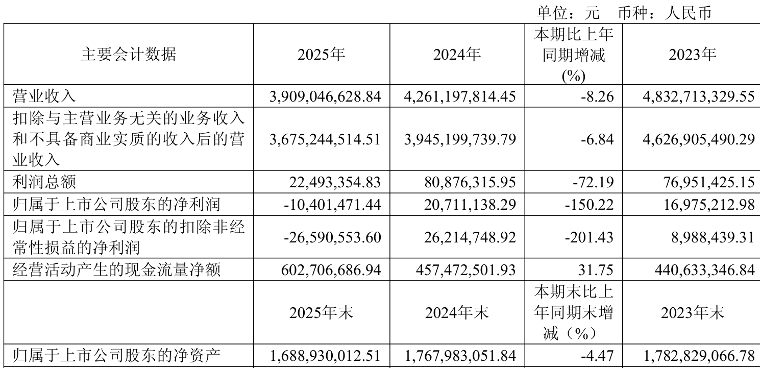 中证智能财讯北巴传媒(600386)4月16日披露2025年年度报告。2025年,公司实现营业总收入39.09亿元,同比下降8.26%;归母净利润亏损1040.15万元,上年同期盈利2071.11万元;扣非净利润亏损2659.06万元,上年同期盈利2621.47万元;经营活动产生的现金流量净额为6.03亿元,同比增长31.75%;报告期内,北巴传媒基本每股收益为-0.013元,加权平均净资产收益率为-0.60%。
