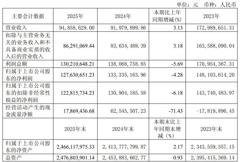 4月15日,春兰股份(600854)发布2025年全年业绩报告,2025年公司实现营业收入9485.86万元,同比增长3.13%,公司实现归属于上市公司股东的净利润1.28亿元,同比下降4.28%,主要原因是房产销售下降较多造成的。