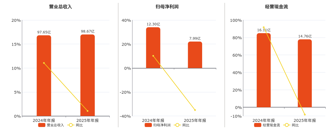 公司营业总收入为98.67亿元。归母净利润为7.99亿元,较去年同报告期归母净利润减少4.31亿元,同比较去年同期下降35.04%。经营活动现金净流入为14.76亿元,较去年同报告期经营活动现金净流入减少1.35亿元,同比较去年同期下降8.36%。