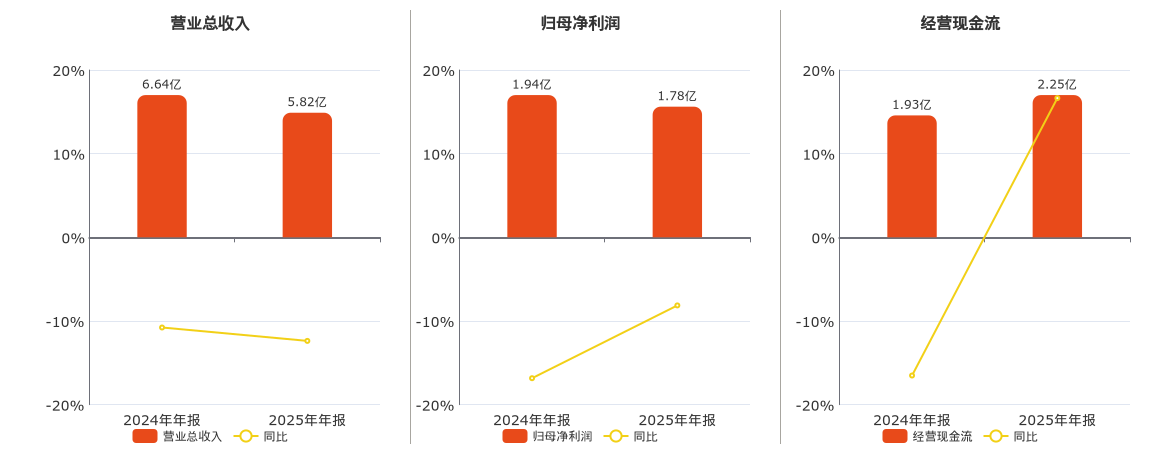 公司营业总收入为5.82亿元,较去年同报告期营业总收入减少8219.19万元,同比较去年同期下降12.38%。归母净利润为1.78亿元,较去年同报告期归母净利润减少1578.70万元,同比较去年同期下降8.14%。经营活动现金净流入为2.25亿元。