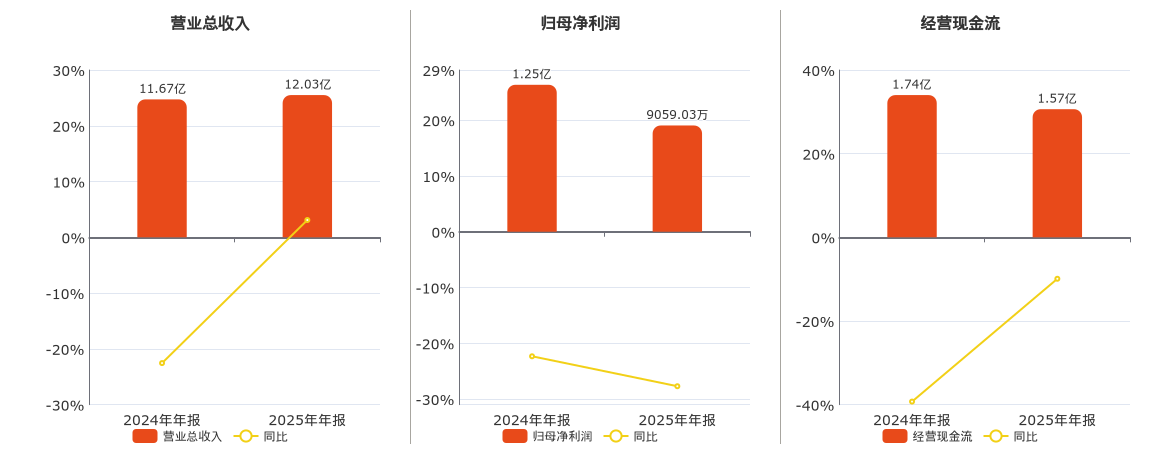 公司营业总收入为12.03亿元。归母净利润为9059.03万元,较去年同报告期归母净利润减少3471.09万元,同比较去年同期下降27.70%。经营活动现金净流入为1.57亿元,较去年同报告期经营活动现金净流入减少1727.13万元,同比较去年同期下降9.91%。