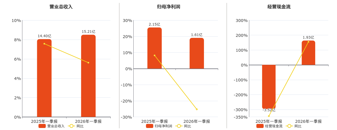 公司营业总收入为15.21亿元。归母净利润为1.61亿元,较去年同报告期归母净利润减少5434.74万元,同比较去年同期下降25.28%。经营活动现金净流入为1.93亿元。