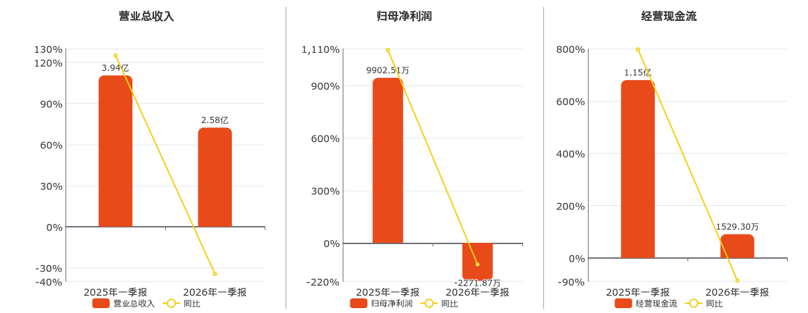 公司营业总收入为2.58亿元,较去年同报告期营业总收入减少1.36亿元,同比较去年同期下降34.51%。归母净利润为-2271.87万元,较去年同报告期归母净利润减少1.22亿元,同比较去年同期下降122.94%。经营活动现金净流入为1529.30万元,较去年同报告期经营活动现金净流入减少9956.64万元,同比较去年同期下降86.69%。