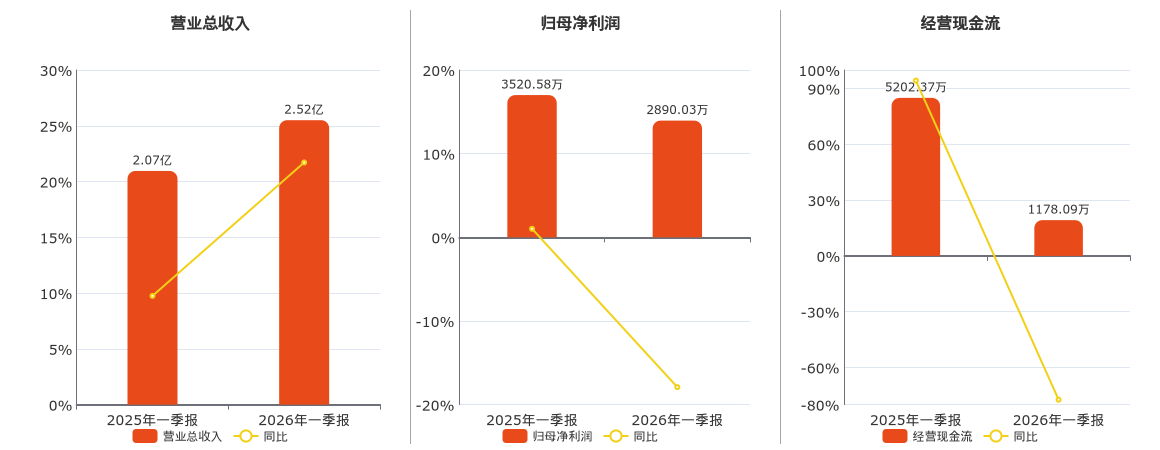 公司营业总收入为2.52亿元。归母净利润为2890.03万元,较去年同报告期归母净利润减少630.55万元,同比较去年同期下降17.91%。经营活动现金净流入为1178.09万元,较去年同报告期经营活动现金净流入减少4024.28万元,同比较去年同期下降77.35%。