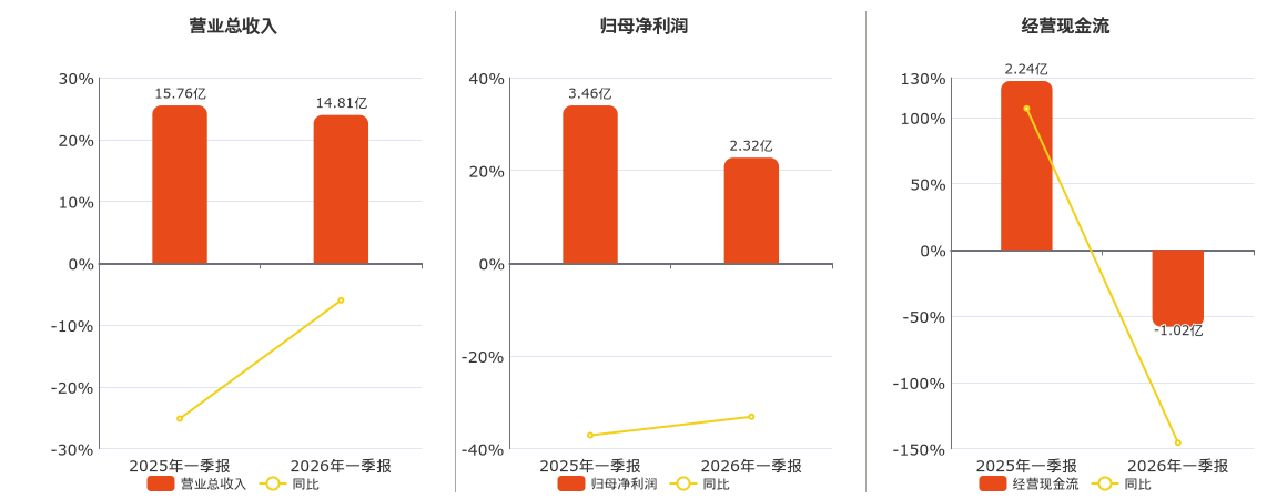 公司营业总收入为14.81亿元,较去年同报告期营业总收入减少9478.89万元,同比较去年同期下降6.01%。归母净利润为2.32亿元,较去年同报告期归母净利润减少1.15亿元,同比较去年同期下降33.10%。经营活动现金净流入为-1.02亿元,较去年同报告期经营活动现金净流入减少3.26亿元,同比较去年同期下降145.50%。