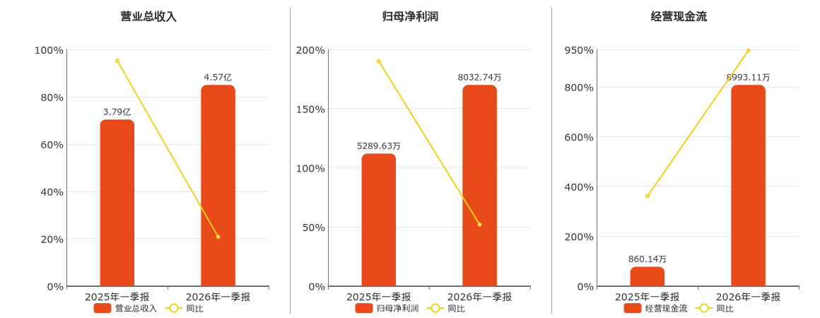 公司营业总收入为4.57亿元,较去年同报告期营业总收入增加7870.98万元,实现3年连续上涨,同比较去年同期上涨20.78%。归母净利润为8032.74万元,较去年同报告期归母净利润增加2743.11万元,实现2年连续上涨,同比较去年同期上涨51.86%。经营活动现金净流入为8993.11万元,较去年同报告期经营活动现金净流入增加8132.97万元,实现2年连续上涨,同比较去年同期上涨945.54%。