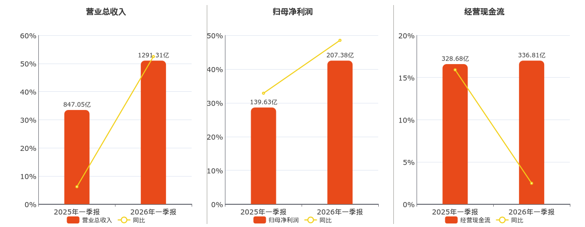 2026年一季报净利润为207.38亿元、宁德时代(300750.SZ)较去年同期上涨48.52%