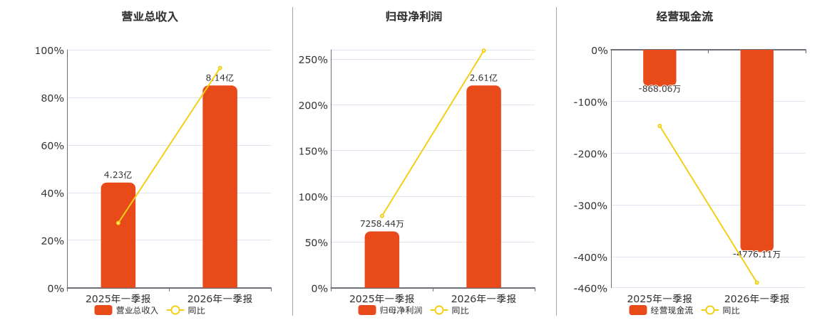 公司营业总收入为8.14亿元,较去年同报告期营业总收入增加3.91亿元,实现3年连续上涨,同比较去年同期上涨92.33%。归母净利润为2.61亿元,较去年同报告期归母净利润增加1.88亿元,实现2年连续上涨,同比较去年同期上涨259.00%。经营活动现金净流入为-4776.11万元。