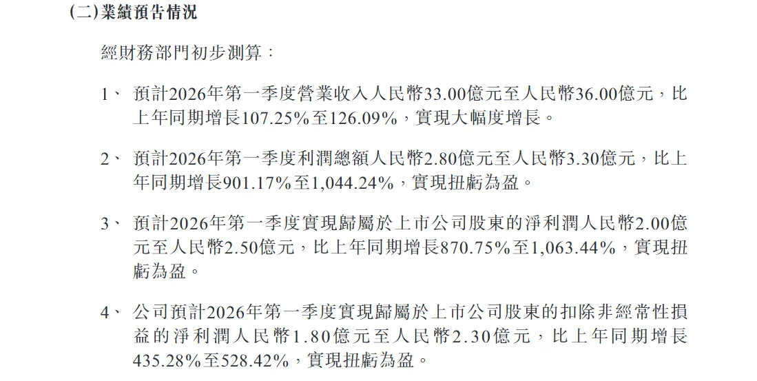 更为亮眼的是利润端的强劲反弹。公司预计一季度利润总额为2.80亿至3.30亿元,同比暴增901.17%至1044.24%;归属于上市公司股东的净利润预计为2.00亿至2.50亿元,成功实现扭亏为盈。