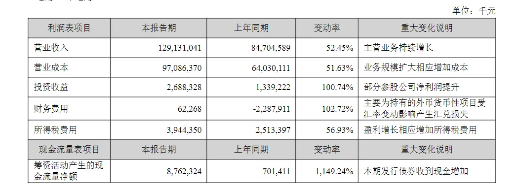 动力电池巨头宁德时代于4月15日披露了2026年第一季度财报。报告期内,公司实现营业收入1291.31亿元,同比增长52.45%;归属于上市公司股东的净利润达207.38亿元,同比增长48.52%,业绩增长主要源于主营业务的持续扩张。