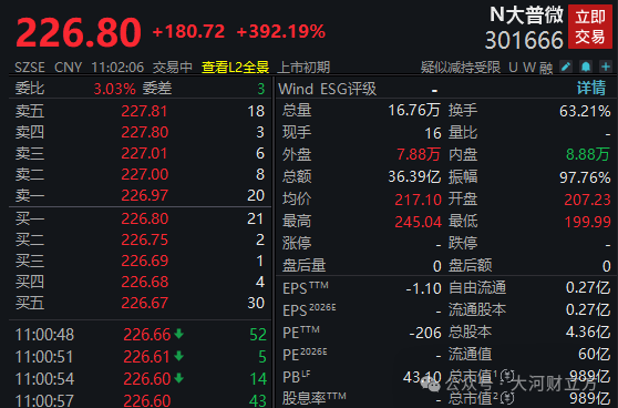 今日三只新股上市,集成电路板块的N大普微上市飙涨超400%,市值一度破1000亿元。大普微是创业板第三套上市标准启用后,首家成功上市的未盈利企业。