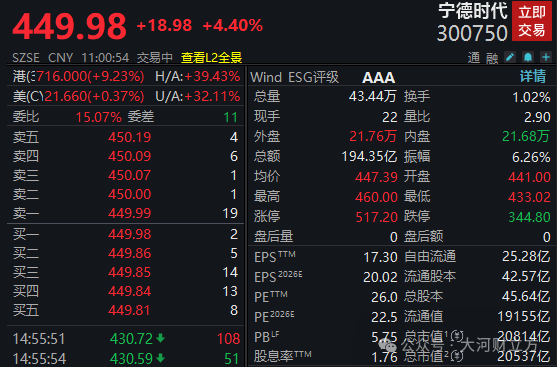宁德时代今日颇为抢眼,盘中涨幅一度扩大至6%,A股总市值超2万亿元,跃居A股总市值第二位,今日成交额超200亿元位居全市场第一。
