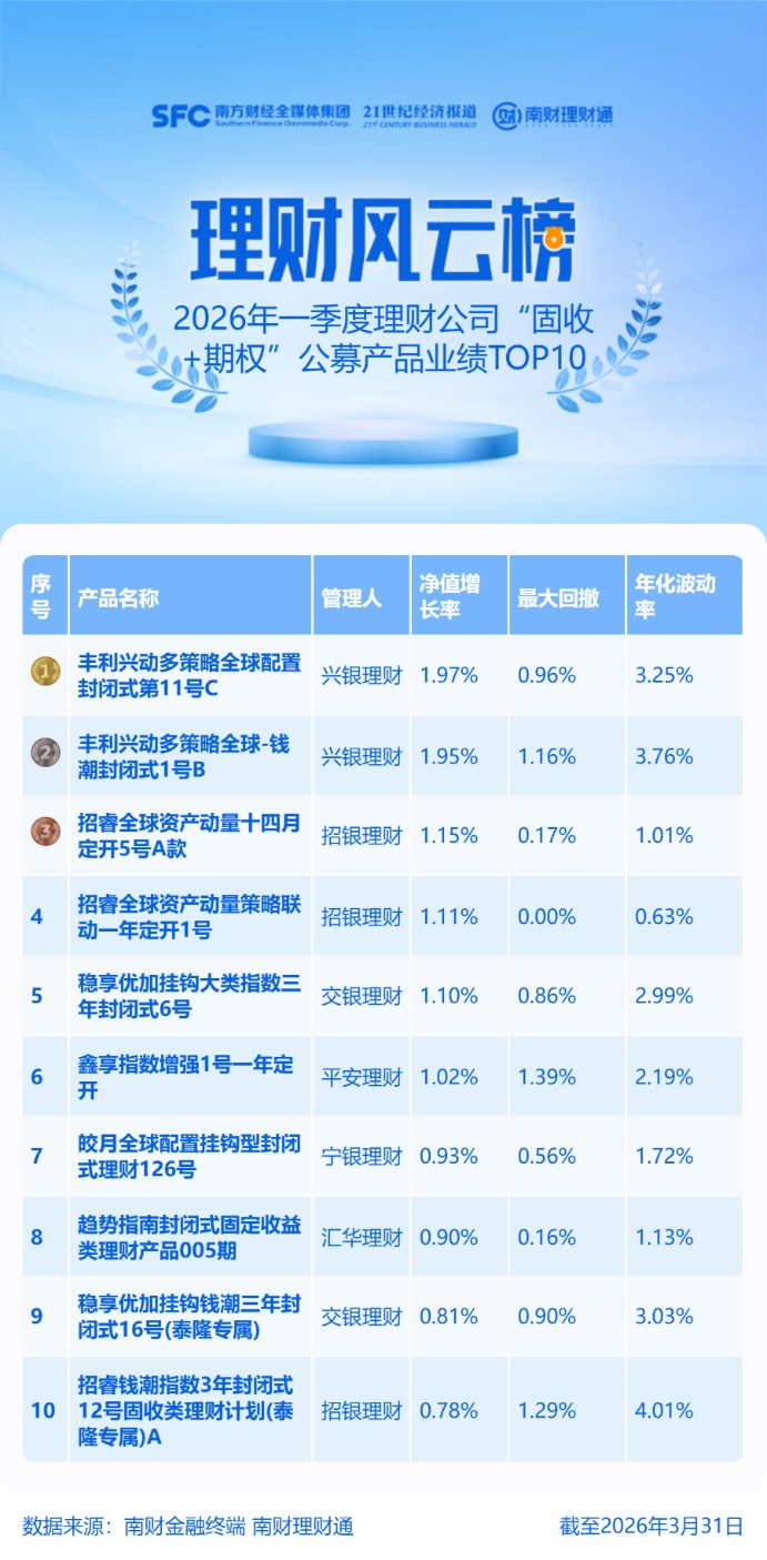 南财理财通数据显示,理财公司存续“固收+期权”公募理财2026年一季度算术平均净值增长率为0.70%,挂钩部分全球大类指数的“固收+期权”理财产品业绩表现亮眼。