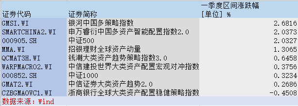 从一季度市场表现看,上述标的分化明显:银河中国多策略指数、申万睿衍中国多资产智能配置指数2.0及中证500涨幅均超2%,MMA指数涨逾1%,而浙商银行全球大类资产配置稳健策略指数(波动率控制1)则微跌0.45%。