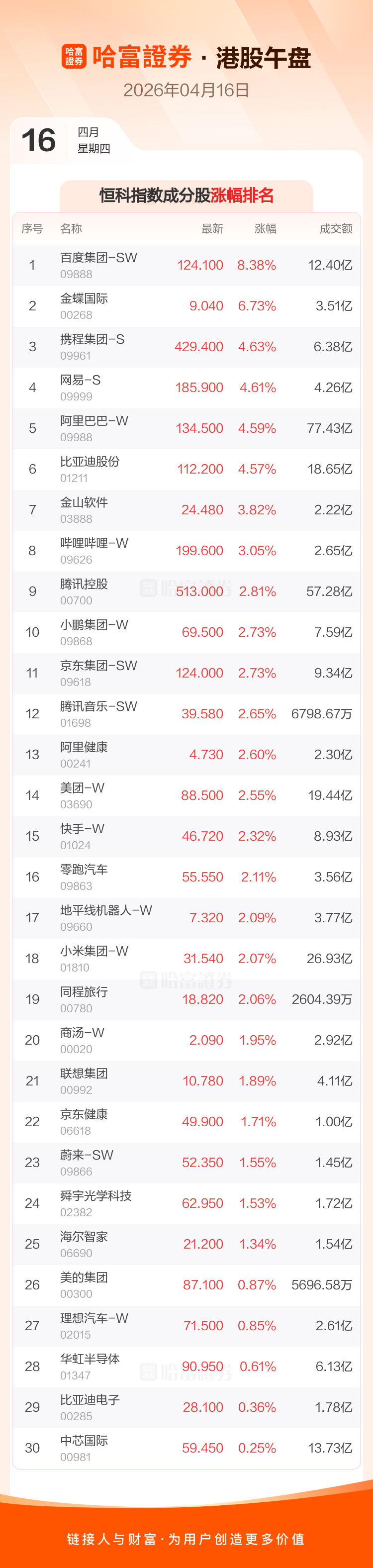 港股4月16日午盘走高,恒生指数收报26306.55点,涨359.23点,涨幅1.38%;恒生科技指数收报5058.15点,涨146.36点,涨幅2.98%。恒生指数成分股中宁德时代、百度集团-SW、海底捞涨幅居前,中国生物制药、老铺黄金、康师傅控股跌幅靠前。恒生科技指数成分股中百度集团-SW、金蝶国际、携程集团-S涨幅居前。