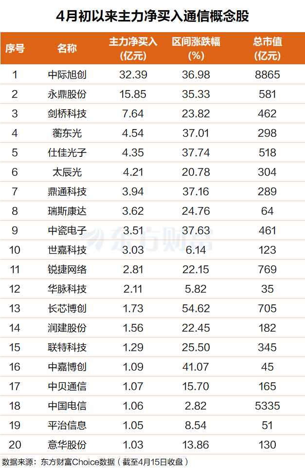 东方财富Choice数据显示,自今年4月初以来,主力资金净买入了一批通信板块个股,净买入额前20个股总金额接近百亿元。