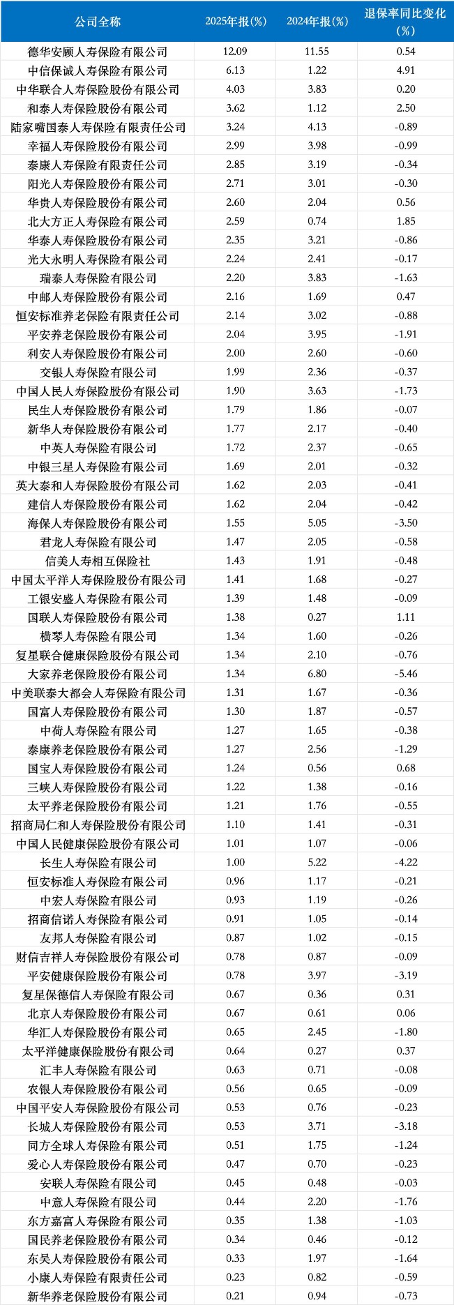 根据企业预警通数据,德华安顾人寿2025年综合退保率居首,达到12.09%,相比2024年上升0.54个百分点。
