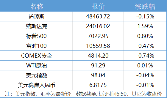 1、美国三大股指收盘涨跌不一,道指跌0.15%报48463.72点,标普500指数涨0.8%报7022.95点;纳指涨1.59%报24016.02点,连续十一日上涨;标普500指数、纳指创收盘新高。卡特彼勒跌超3%,默克跌逾1%,领跌道指。Allbirds大涨超582%,盘中多次触发熔断机制。该公司宣布将彻底转型,从制鞋业务转向AI计算基础设施服务。万得美国科技七巨头指数涨2.22%,特斯拉涨超7%,微软涨逾4%。纳斯达克中国金龙指数涨0.75%,小马智行涨近8%,再鼎医药涨近6%。