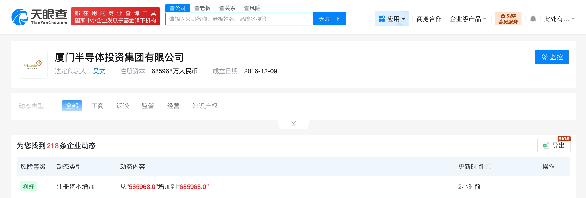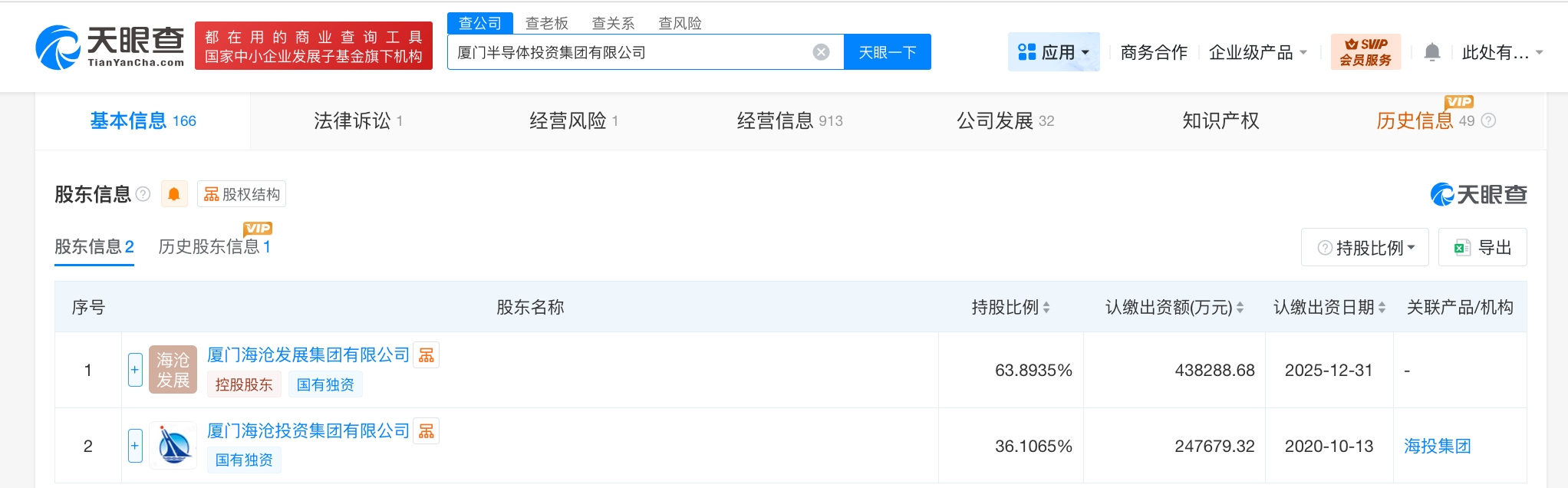 天眼查App显示,近日,厦门半导体投资集团有限公司发生工商变更,注册资本由约58.6亿元人民币增至约68.6亿元人民币,增幅约17%。该公司成立于2016年12月,法定代表人为吴文,经营范围为以自有资金从事投资活动、自有资金投资的资产管理服务、半导体分立器件制造、工程和技术研究和试验发展、技术推广服务,由厦门海沧发展集团有限公司、厦门海沧投资集团有限公司共同持股。
