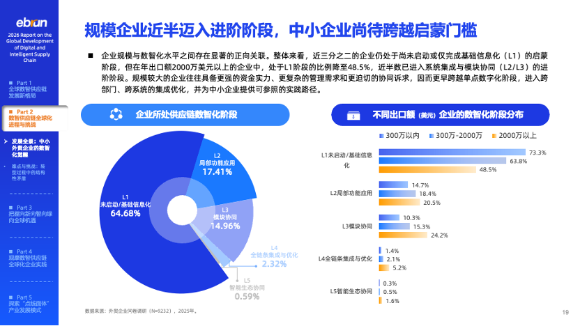 数智化转型加速分化,规模企业率先进阶,中小企业待发力。近三分之二的企业仍处于数智化启蒙阶段,但年出口额2000万美元以上的企业中,已有近半数进入系统集成与模块协同的进阶阶段。