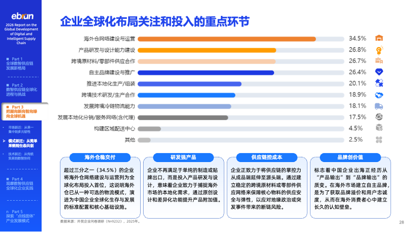 基建升级:超过三分之一的企业将海外仓网络建设列为全球化投入首位,正在探索通过物联网、AMR机器人、AI算法让海外仓从成本中心转变为利润枢纽。