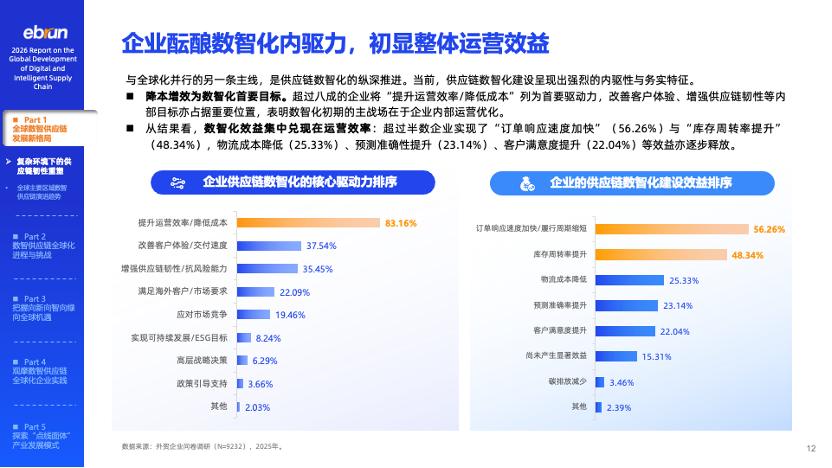 企业酝酿数智化内驱力,降本增效成果初显。超过八成的企业将“提升运营效率、降低成本”作为数智化的首要驱动力。从效果看,超半数企业实现了订单响应速度加快,近一半企业库存周转率提升。物流成本降低、预测准确性提高、客户满意度上升等效益也在逐步释放。