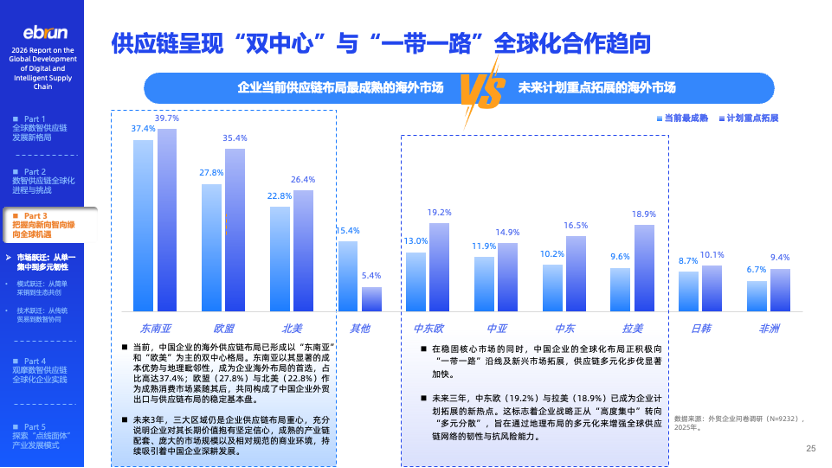 市场布局:双中心稳固,新兴市场加速成为新增长极。东南亚与欧美构成的“双中心”格局持续巩固,同时中东欧、拉美、中亚等“一带一路”共建国家市场关注度显著提升。近半数企业看好沿线国家的基础设施合作机遇,RCEP区域的供应链协同也成为企业布局的新方向。