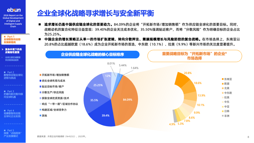 市场扩张仍是主引擎,风险分散成为新共识。84.09%的企业将“开拓新市场、增加销售额”作为供应链全球化的首要目标。39.40%的企业关注成本优化,而明确将“分散风险”纳入战略考量的企业占比已达25.25%。