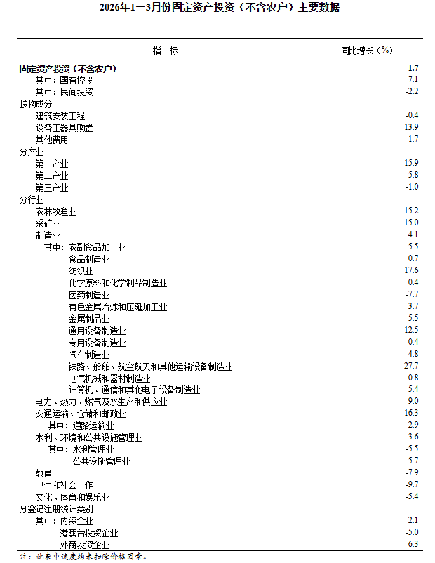 国家统计局:1~3月份全国固定资产投资增长1.7%