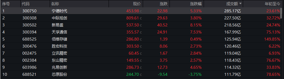 个股方面,宁德时代成交额超285亿元居沪深两市第一,中际旭创、新易盛等个股成交额紧跟其后。