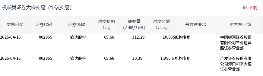 钧达股份今日大宗交易折价成交342.68万股 成交额2.25亿元