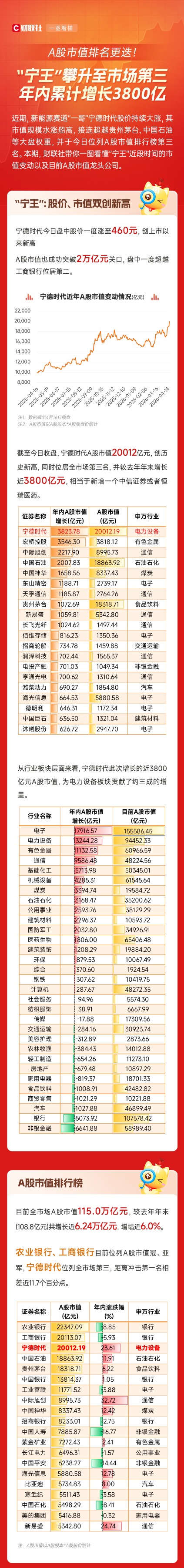 2万亿新里程碑!宁德时代摘得A股市值探花 年内暴增近3800亿