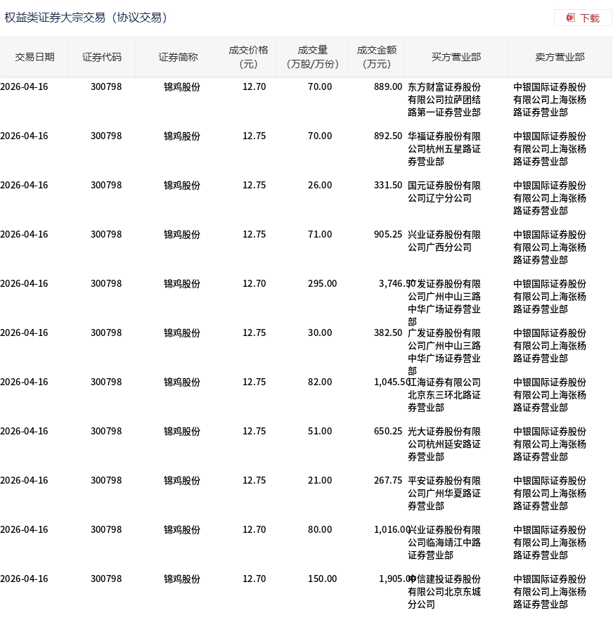 锦鸡股份今日大宗交易成交946万股,成交额1.2亿元