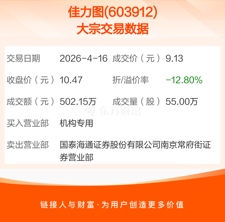 2026年4月16日,佳力图发生1笔大宗交易,共成交55.00万股,成交金额502.15万元,占其流通市值比例为0.09%。