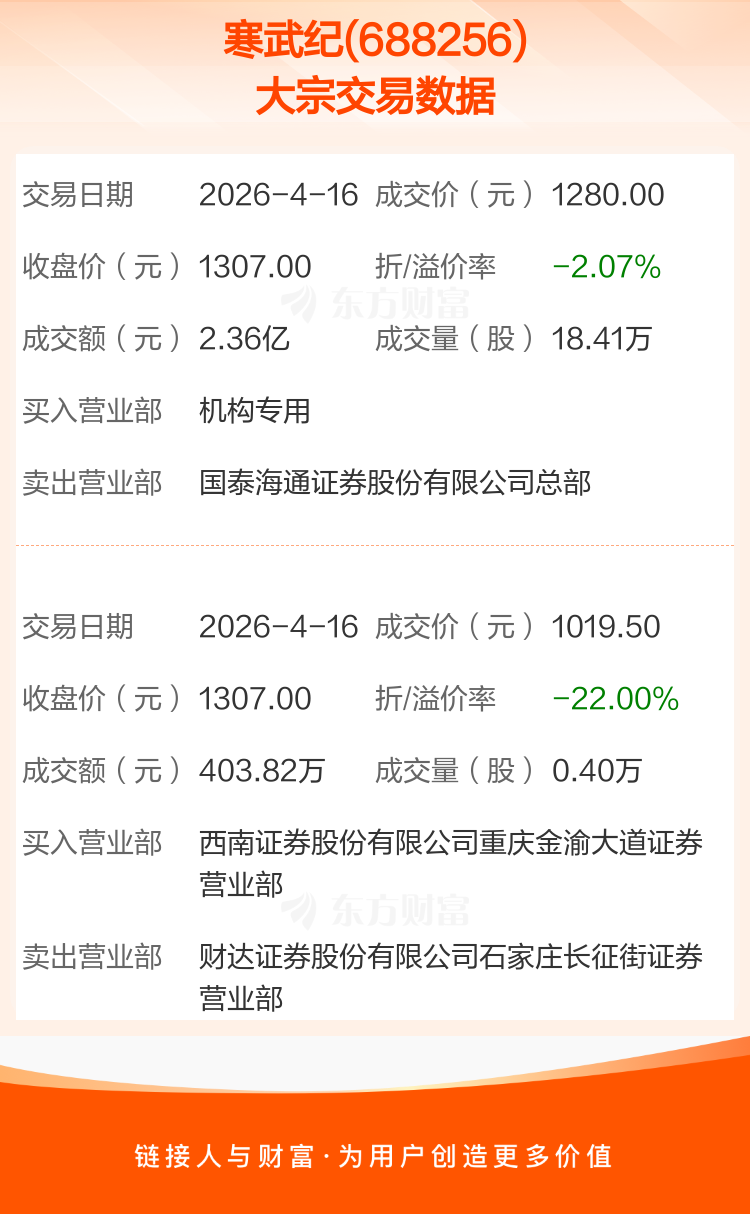 2026年4月16日,寒武纪发生2笔大宗交易,共成交18.81万股,成交金额2.40亿元,占其流通市值比例为0.04%。