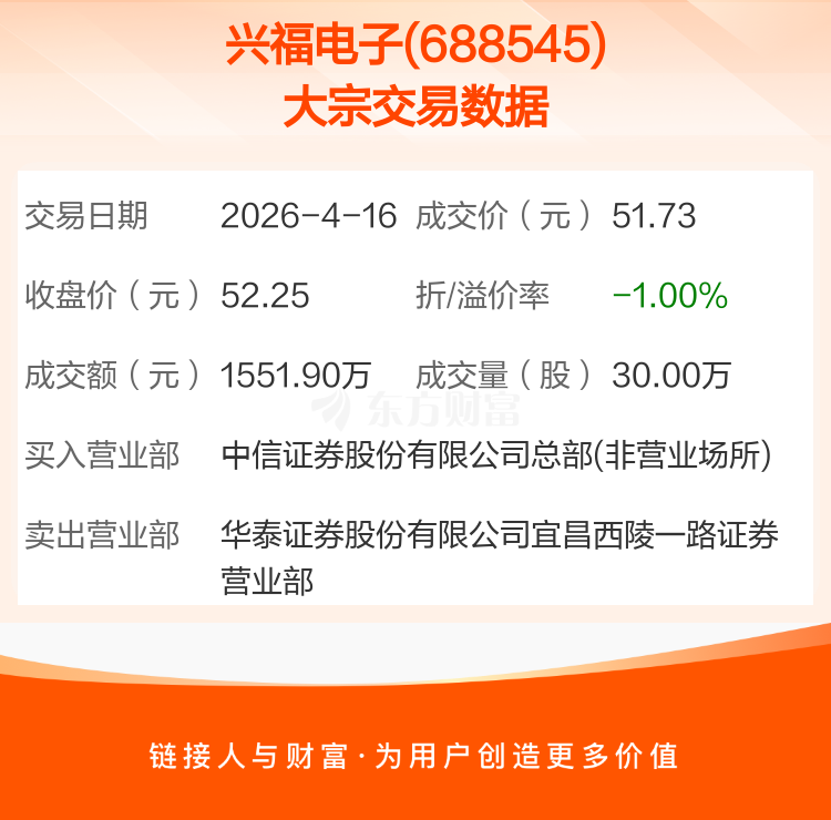 2026年4月16日,兴福电子发生1笔大宗交易,共成交30.00万股,成交金额1551.90万元,占其流通市值比例为0.16%。