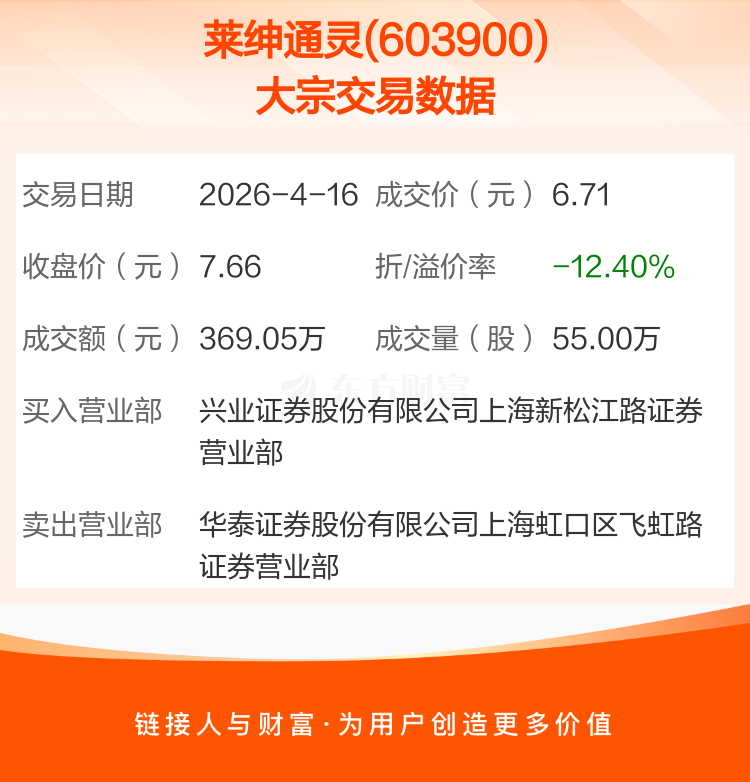 2026年4月16日,莱绅通灵发生1笔大宗交易,共成交55.00万股,成交金额369.05万元,占其流通市值比例为0.14%。