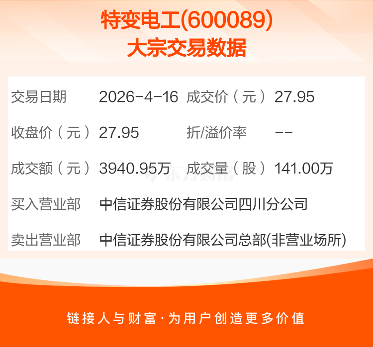 2026年4月16日,特变电工发生1笔大宗交易,共成交141.00万股,成交金额3940.95万元,占其流通市值比例为0.03%。