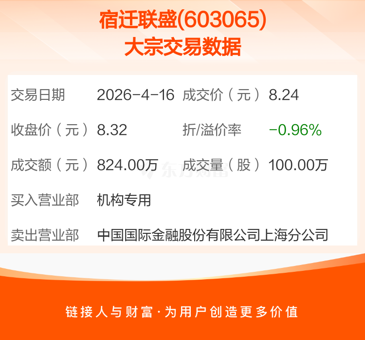 2026年4月16日,宿迁联盛发生1笔大宗交易,共成交100.00万股,成交金额824.00万元,占其流通市值比例为0.24%。
