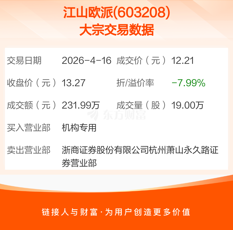 2026年4月16日,江山欧派发生1笔大宗交易,共成交19.00万股,成交金额231.99万元,占其流通市值比例为0.10%。