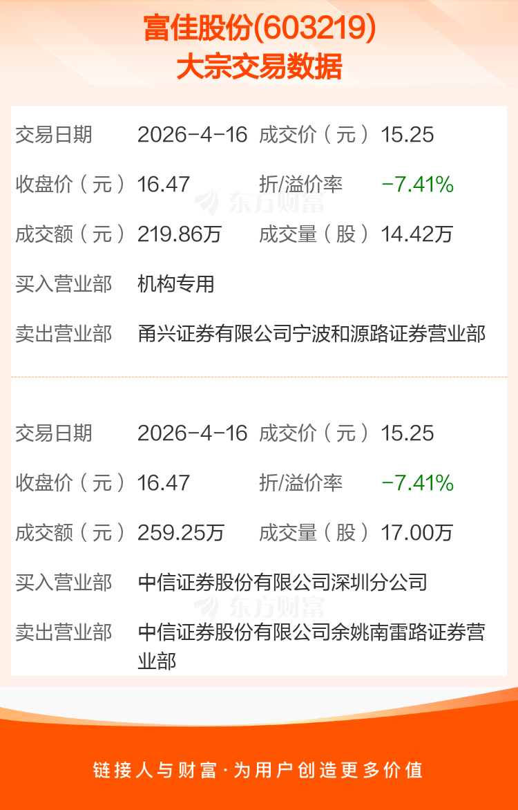 2026年4月16日,富佳股份发生2笔大宗交易,共成交31.42万股,成交金额479.11万元,占其流通市值比例为0.05%。