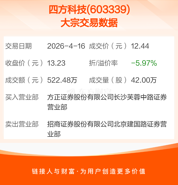 2026年4月16日,四方科技发生1笔大宗交易,共成交42.00万股,成交金额522.48万元,占其流通市值比例为0.13%。