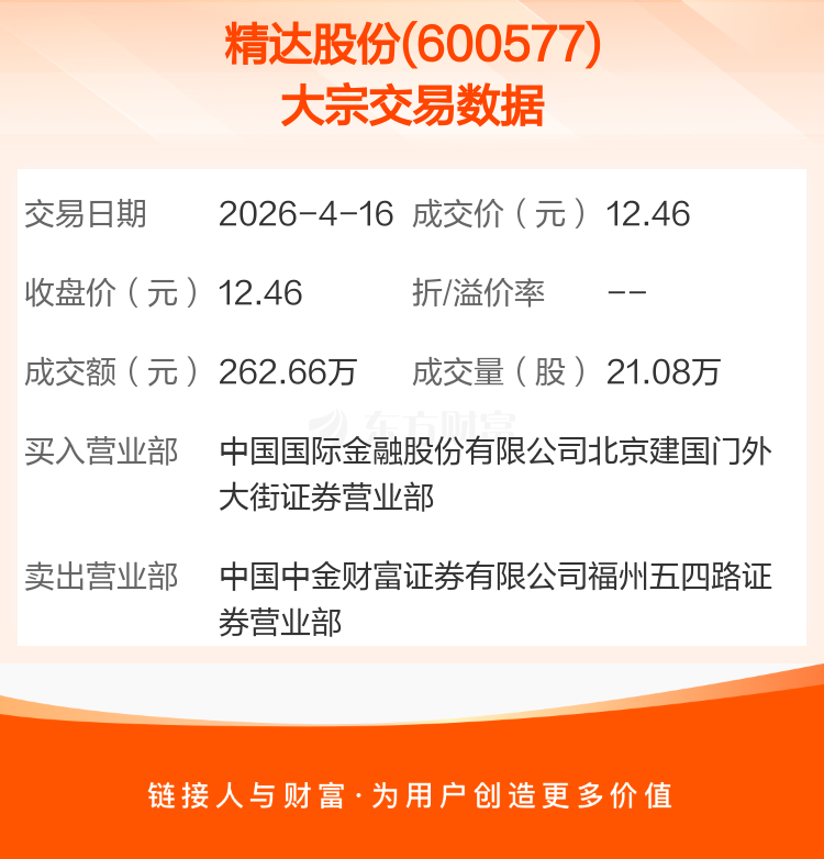 2026年4月16日,精达股份发生1笔大宗交易,共成交21.08万股,成交金额262.66万元。