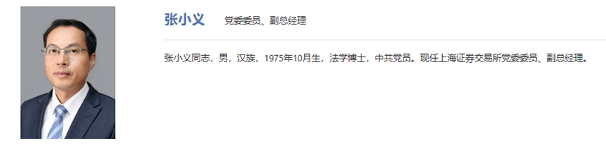 公开信息显示,张小义,1975年10月生,法学博士,中共党员,曾担任上交所上市公司管理一部总监、债券业务中心常务副主任等职。