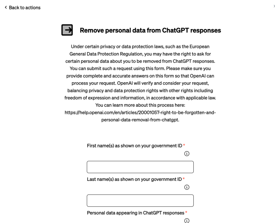 一个最佳实践范本可能是OpenAI。在欧盟要求下,ChatGPT在2023年推出了个人数据请求表(Personal equest),允许欧洲公民从公司记录中删除个人数据、撤回同意。这份专门的个人数据处理页面,会让用户提交姓名、包含个人数据的网址、ChatGPT中出现的个人数据、提示词和对话链接。