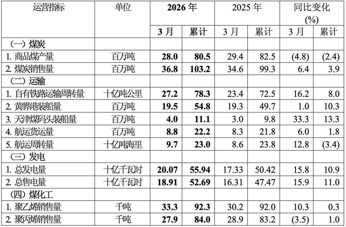 4月16日,中国神华(601088/01088)发布公告,2026年3月份主要运营数据显示,公司商品煤产量为2800万吨,较2025年同期下降4.8%;煤炭销售量为3680万吨,同比增长6.4%。