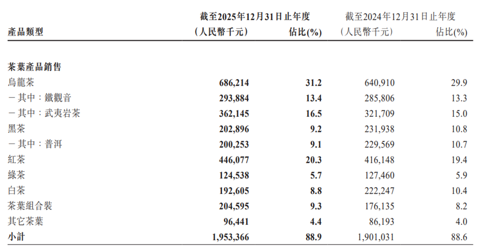 作为全品类茶企,八马茶业的产品涵盖乌龙茶、红茶、黑茶、白茶、绿茶等,2025年茶叶产品收入19.53亿元,占总营收的88.9%,同比增长2.75%,增速与整体营收基本持平。