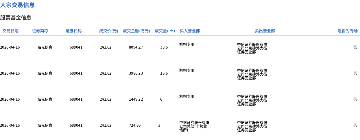 海光信息今日大宗交易折价成交59万股,成交额1.43亿元