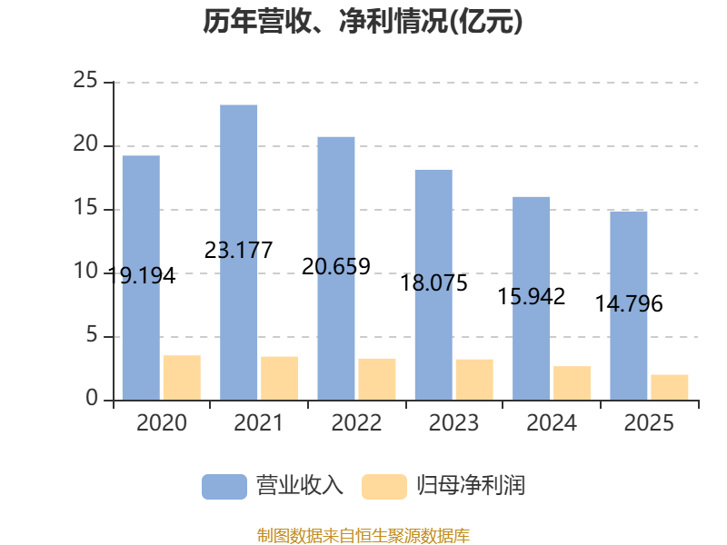 中证智能财讯滇池水务(03768)4月16日披露2025年度报告。报告期内,公司实现营业收入14.8亿元,同比下降7.19%;归母净利润1.96亿元,同比下降25.46%;据报告显示,滇池水务基本每股收益为0.19元,平均净资产收益率为3.73%。