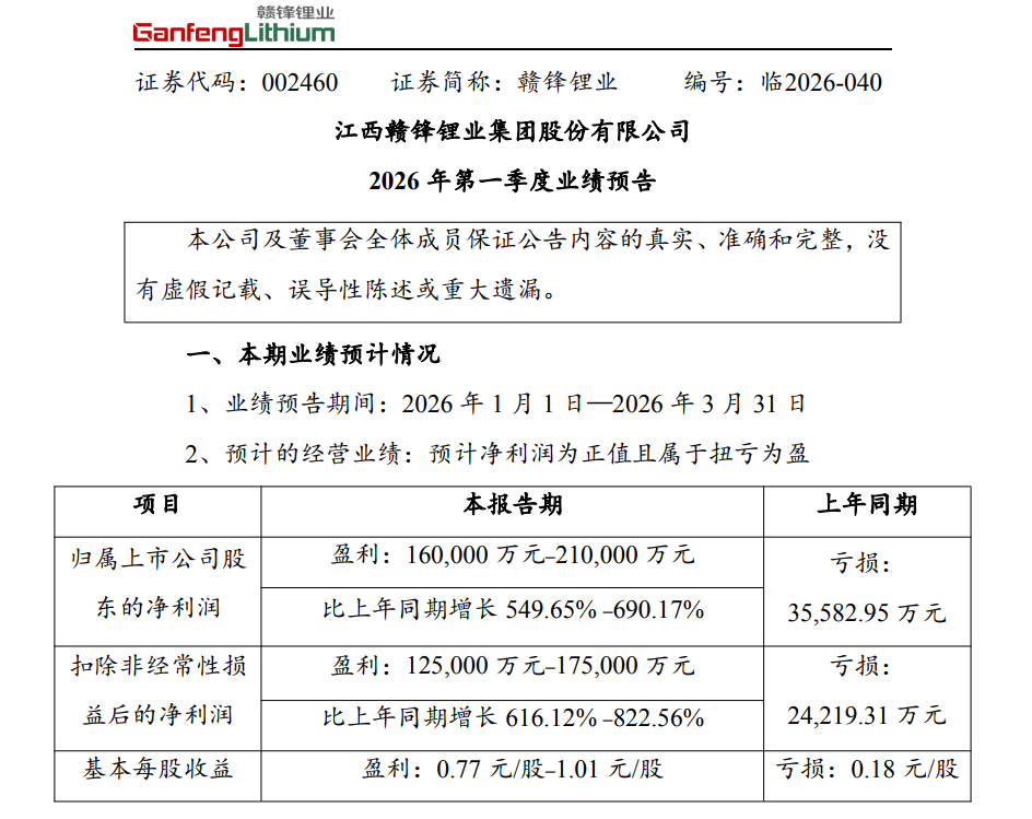 赣锋锂业:预计一季度净利润16亿元—21亿元 同比扭亏为盈